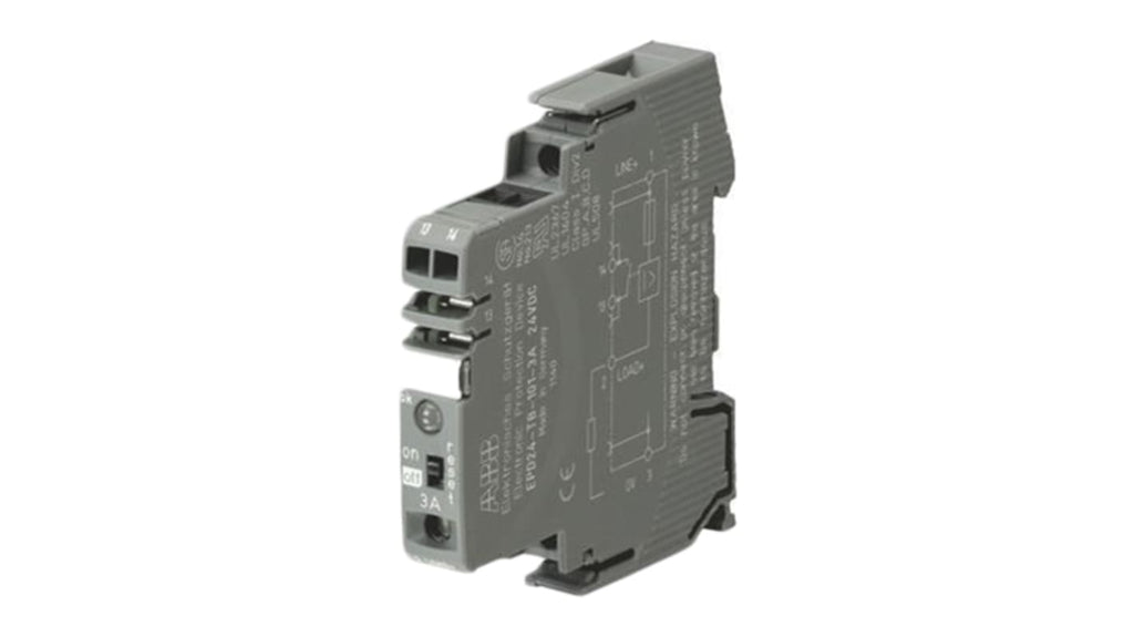 Interruttore di sicurezza elettronico, dispositivo di protezione serie EPD24, corrente nominale 0.5A, tensione 24V c.c., montaggio su guida DIN, scollegamento per sovraccarico a 1.1 x IN, attivazione carichi capacitivi fino a 20000 μF, indicazione di stato e guasto tramite LED e contatto ausiliario, larghezza 12.5 mm, cablaggio semplice tramite barra di distribuzione LINE+ e 0 V. Codice costruttore 2CDE601101R2905, marchio ABB.