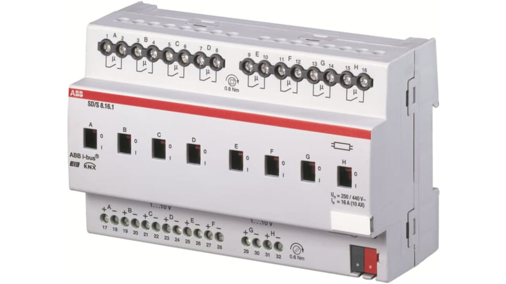 Modulo I/O per sistema bus KNX, attuatore di regolazione/commutazione per 2, 4 o 8 gruppi di illuminazione, ingressi di controllo 1-10V, relè privo di potenziale attivabile tramite i-bus ABB, montaggio su guida DIN, protezione IP20, dimensioni 3,54 x 2,83 x 2,53 poll. Codice costruttore 2CDG110081R0011, marchio ABB.