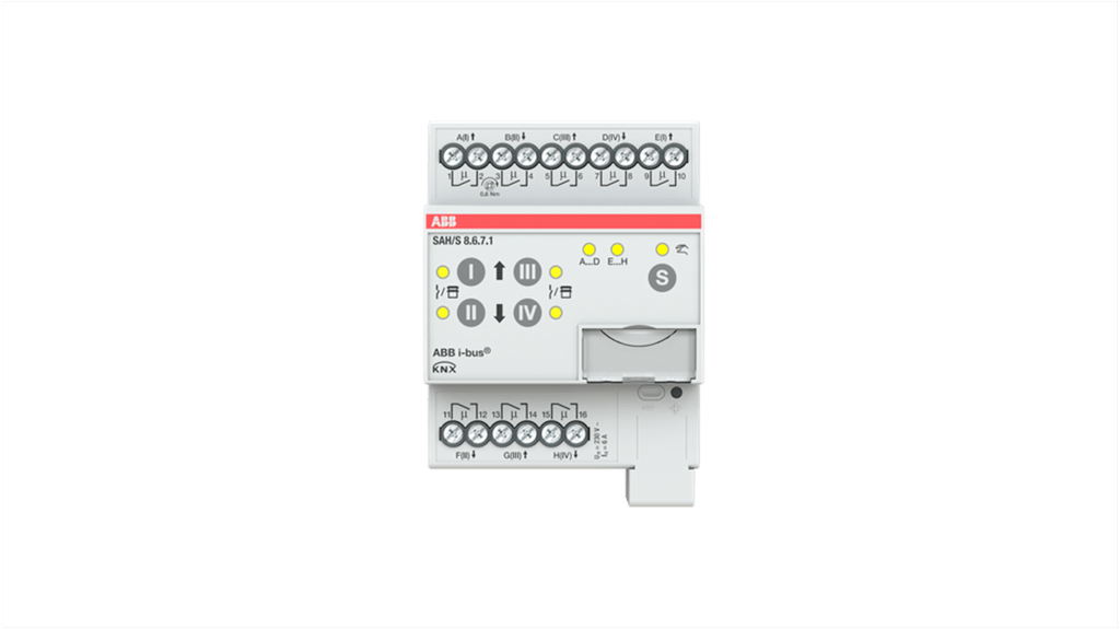 Modulo I/O PLC per Sistema bus KNX, attuatore interruttore/otturatore serie SAH/S, design modulare PROM, installazione in morsettiere di distribuzione elettrica, montaggio su guida da 35 mm, relè di commutazione indipendenti, morsetto a vite, grado di protezione IP20, indicazione della posizione del contatto, funzionamento manuale. Codice costruttore 2CDG110244R0011 SAH/S8.6.7.1, marchio ABB.