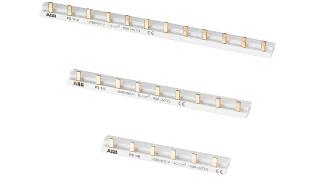 Barra di distribuzione ABB per DDA200, F200, S200, codice costruttore 2CDL210001R1038, tensione d'esercizio nominale 690 V c.a./c.c., sezione trasversale 10 mm², adatta per dispositivi a 1 polo e contatti ausiliari, contenitore grigio chiaro, categoria sovratensione III, specifiche tecniche: accessori, barra di distribuzione, gamma IEC.