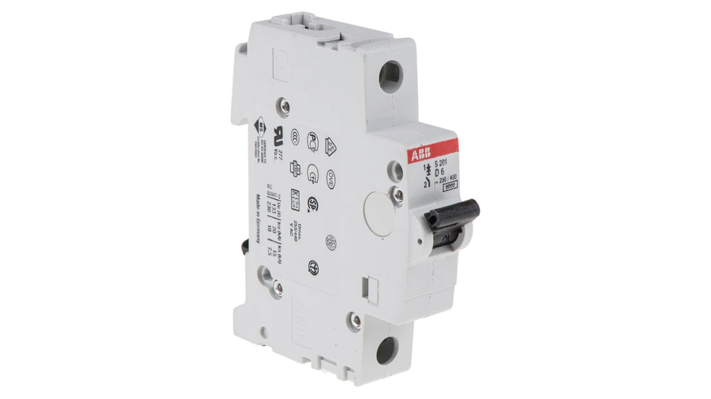 Interruttore magnetotermico ABB 1P 6A 6 kA, Tipo D, montaggio su guida DIN, serie System Pro M Compact S201-D6, tensione nominale c.a. 253V, tensione nominale c.c. 72V, capacità di rottura 6 kA, meccanismo di scatto termico ed elettromeccanico, morsetti a vite, larghezza 17.5mm, lunghezza 69mm, profondità 76mm, applicazioni commerciali e residenziali, conforme a BS EN 60898.