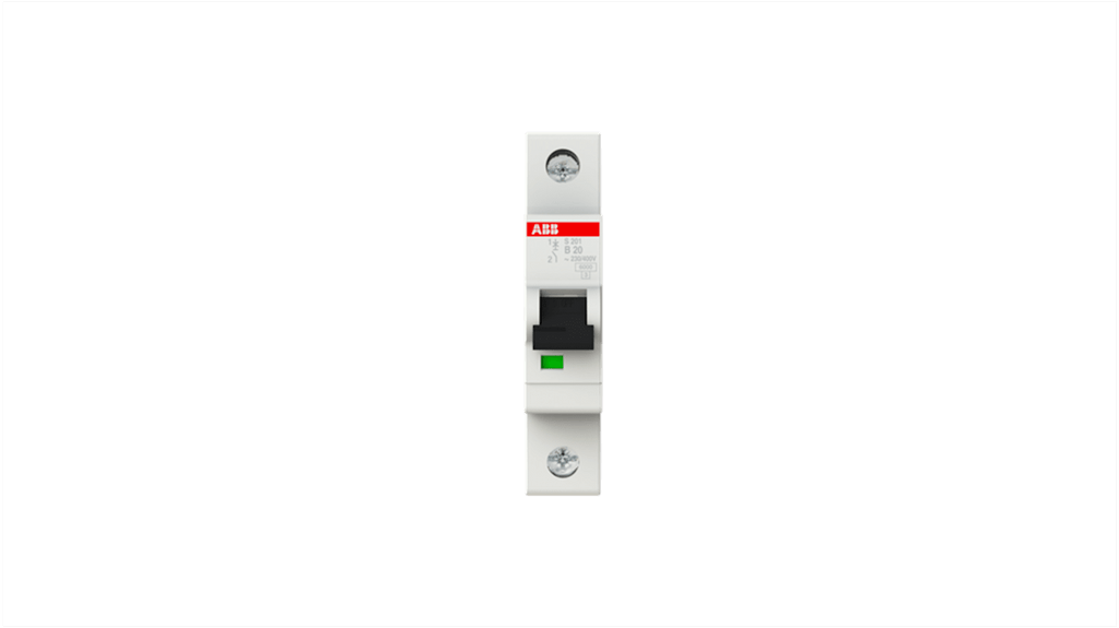 Interruttore magnetotermico ABB 1P 20A, Tipo B, per protezione contro sovraccarichi e cortocircuiti, meccanismo di scatto termico ritardato e elettromeccanico, grado di protezione IP20, montaggio su guida DIN, serie S200, gamma System Pro M Compact, esclusivo terminal doppio brevettato con viti prigioniere, numero modello S201-B20, capacità di intervento 10 KA.
