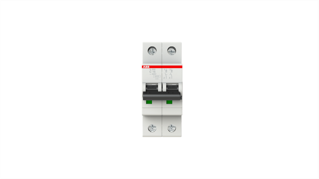 Interruttore magnetotermico ABB 2P 16A 6 kA, Tipo C, tensione nominale 400V, capacità di rottura 6 kA, montaggio su guida DIN, larghezza 35 mm, lunghezza 88 mm, profondità 69 mm, peso 225 g, grado di protezione IP20, attuatore bistabile, meccanismo di scatto termico, applicazioni commerciali e residenziali. Codice costruttore 2CDS252001R0164 S202-C16.