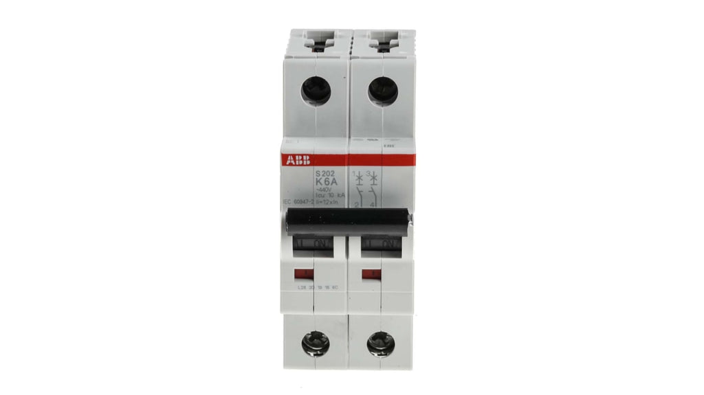 Interruttore magnetotermico ABB, 2 poli, 6 A, tipo K, capacità di rottura 6 kA, tensione nominale c.a. 400 V, tensione nominale c.c. 125 V, montaggio guida DIN, larghezza 35 mm, lunghezza 88 mm, profondità 69 mm, meccanismo di scatto termico, tipo di attuatore bistabile, applicazioni commerciali e industriali, resistenza agli urti fino a 25 g, intervallo di temperatura -25 °C a +55 °C.