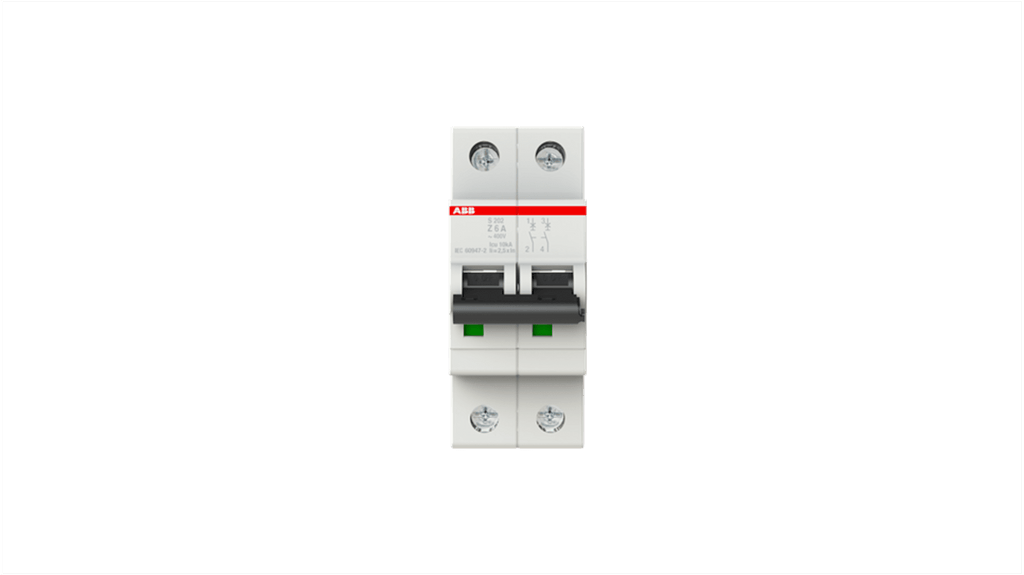 Interruttore automatico ABB, 2 poli, 6A, 10 kA, Tipo Z, tensione nominale c.a. 440V, tensione nominale c.c. 125V, serie S202, design compatto, struttura robusta, componenti ad alte prestazioni, tecnologia avanzata, molteplici funzioni di sicurezza. Codice costruttore 2CDS252001R0378.