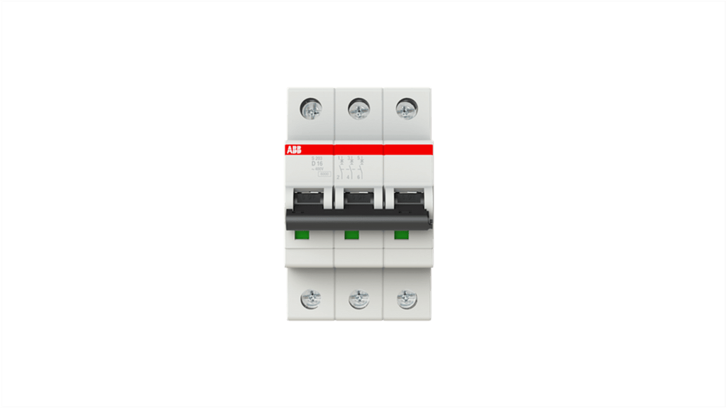 Interruttore magnetotermico ABB 3P 16A 6 kA, Tipo D, corrente nominale 16 A, capacità di rottura 6 kA, tensione nominale c.a. 440 V, tensione nominale c.c. 12 V, montaggio su guida DIN, larghezza 52.5 mm, lunghezza 88 mm, profondità 69 mm, resistenza meccanica 20.000 cicli, intervallo di temperatura -25 °C a +55 °C, conforme a BS EN 60898, applicazioni commerciali e industriali.