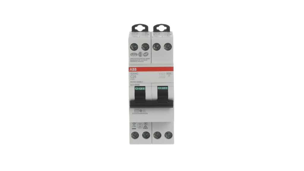Interruttore magnetotermico 4 poli, 25A, caratteristica di intervento Tipo C, tensione nominale 415V, capacità di rottura 6 kA, serie S200C, montaggio su guida DIN, dimensioni 70mm x 36mm x 70mm, conforme a IEC/EN 60898-1 e IEC/EN 60947-2, interruttore bistabile, contatto ausiliario montabile sul fondo per ottimizzazione dello spazio. Codice costruttore 2CDS254280R0254, marchio ABB.