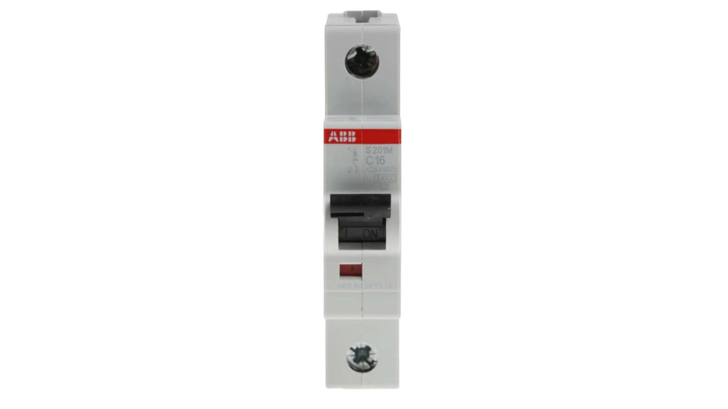 Interruttore magnetotermico ABB 1P 16A 10 kA, Tipo C, corrente nominale 16 A, tensione nominale 253 V CA/72 V CC, capacità di rottura 10 kA, montaggio guida DIN, dimensioni 88 mm x 17.5 mm x 69 mm, meccanismo di scatto termico, tipo di contatto terminale a vite, ignifugo, conforme alla norma BS EN 60898, compatibile con barre di distribuzione.