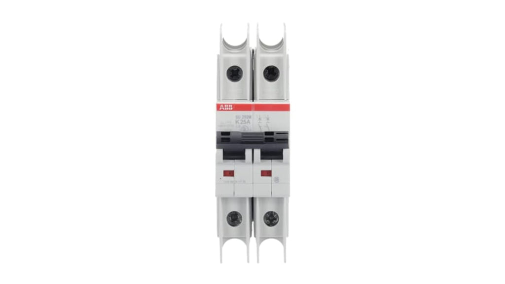 Interruttore automatico ABB, 2 poli, corrente nominale 25 A, caratteristica di intervento Tipo K, tensione nominale di esercizio 440 V AC, capacità di cortocircuito 15 kA, tensione di prova dielettrica 2 kV, tensione di resistenza agli impulsi 4 kV, resistenza meccanica 20000 cicli, design compatto, conforme agli standard IEC, serie SU 200 M.