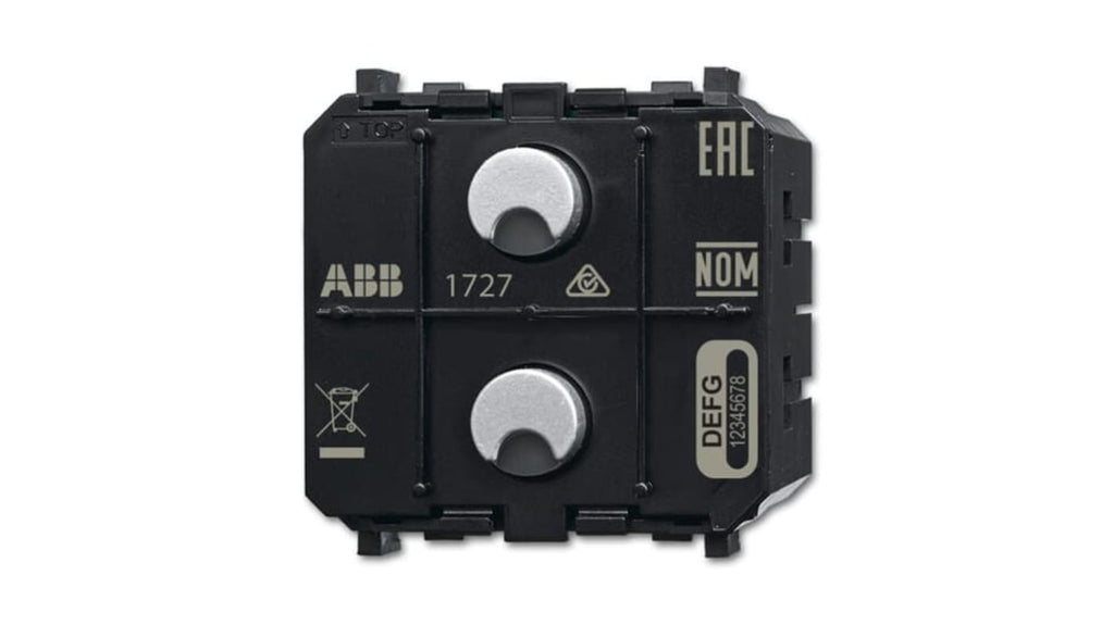 Modulo I/O per automazione ABB free@home, attuatore sensore/interruttore wireless, commutazione a 230 V ca, ingresso unità di prolunga On/Off, collegamento a 3 fili con conduttore neutro, compatibile con bilanciere a 1 modulo da 6230-10-xxx a 6234-10-xxx, grado di protezione IP20, montaggio a filo, dimensioni 2,79 x 2,79 x 1,79 poll. Codice costruttore 2CKA006200A0108.