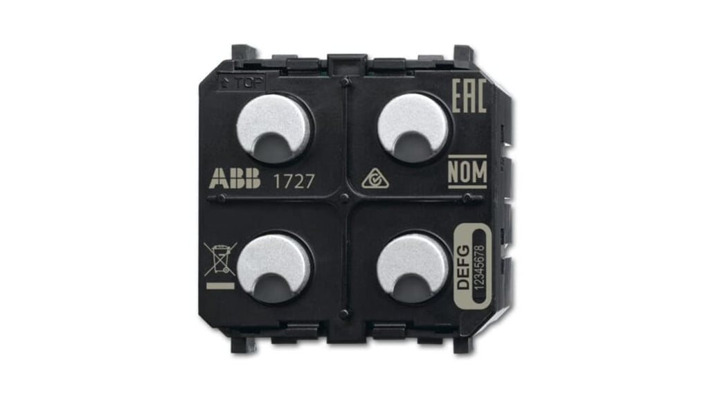 Modulo I/O per automazione ABB free@home, attuatore sensore/interruttore 2/2gang wireless, commutazione consumatori a 230 V ca, comunicazione wireless, interruttore integrato, collegamento a 3 fili con conduttore neutro, ingresso unità di prolunga 230 V On/Off, ganci di fissaggio inclusi, grado di protezione IP20, montaggio a filo, dimensioni 2,79 x 2,79 x 1,79 poll.