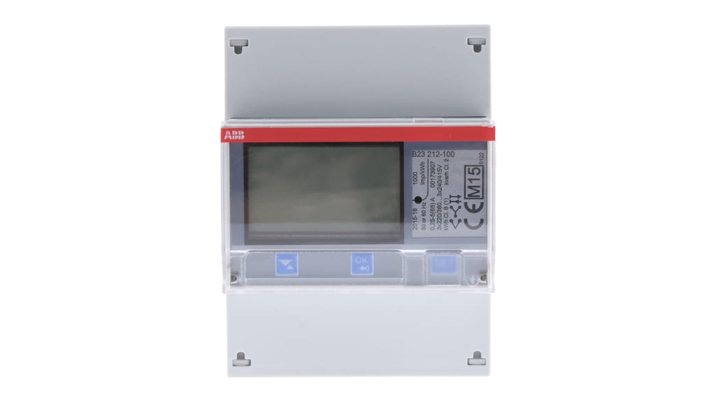 Contatore di energia trifase ABB, modello B23, precisione 1%, display LCD a 7 cifre, grado di protezione IP20, uscita impulsi, intervallo di temperatura da -40 a +70 gradi Celsius, dimensioni 70mm x 26.5mm x 65mm, approvazioni IEC. Misura potenza attiva e reattiva, compatibile con interfacce bus seriali, coperchio in PC per protezione da manomissioni.