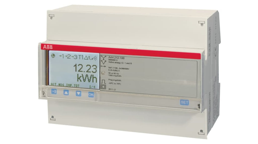 Contatore di energia trifase ABB, A44 212, display orientato ai pixel, corrente nominale massima 6 A, precisione misuratore ±1% energia attiva, ±2% energia reattiva, temperatura operativa -40°C a +70°C, montaggio su guida DIN, uscita impulsi, interfaccia Modbus RTU integrata, dimensioni 123mm x 65mm x 26.5mm. Adatto per stazioni elettriche, laboratori, officine automobilistiche e pavimenti di fabbrica.