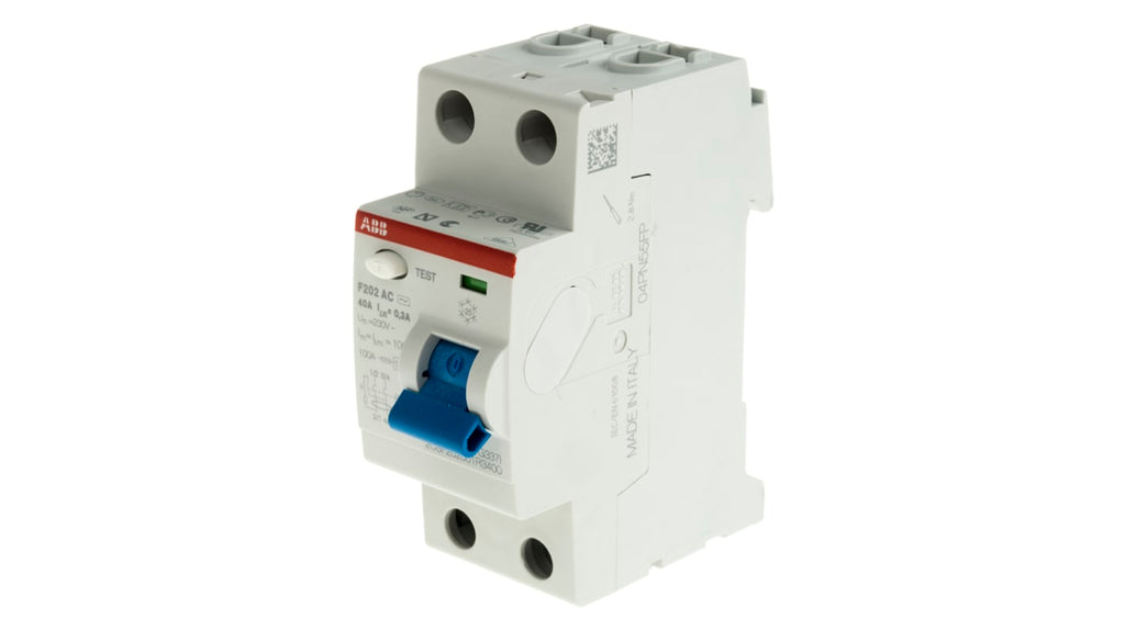 RCCB a 2 poli serie F200, 40A, sensibilità 300mA, tipo AC, montaggio su guida DIN, indicatore meccanico di innesto, progettato per protezione contro guasti a massa, compatto, adatto per applicazioni commerciali e industriali, temperatura d'esercizio da -25 a +55 gradi Celsius, campo di frequenza ottimale da 50 a 60 Hz.