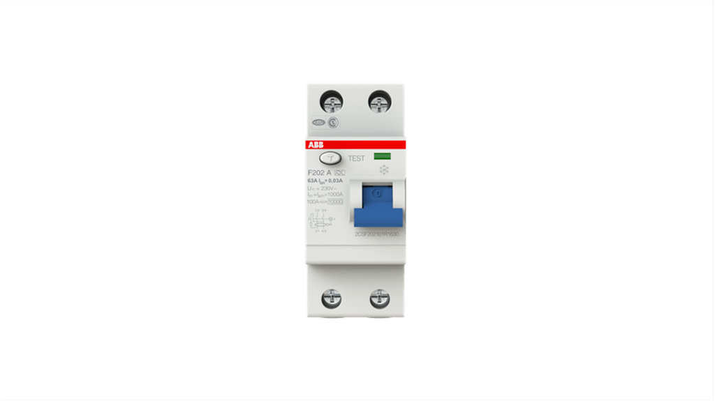 RCCB ABB F202, 2 poli, 63A, sensibilità 30mA, tipo A, montaggio su guida DIN, tensione nominale 230V ca, caratteristica di intervento istantanea, temperatura operativa da -25 a 55 gradi Celsius. Progettato per proteggere persone e impianti contro la corrente di guasto a terra. Codice costruttore 2CSF202101R1630 F202 A-63/0.03.