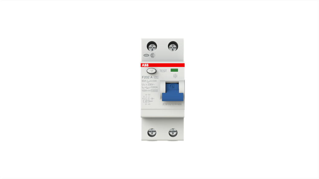 Interruttore automatico di corrente residua RCCB ABB F200, 2 poli, 80A, sensibilità 30mA, Tipo A, tensione nominale 230V ca, grado di protezione IP2X, temperatura d'esercizio da -25 a 55 gradi Celsius, gamma di frequenza da 50 a 60 Hz, montaggio su guida DIN. Utilizzato per protezione contro la corrente di guasto a terra in applicazioni industriali, domestiche e commerciali.