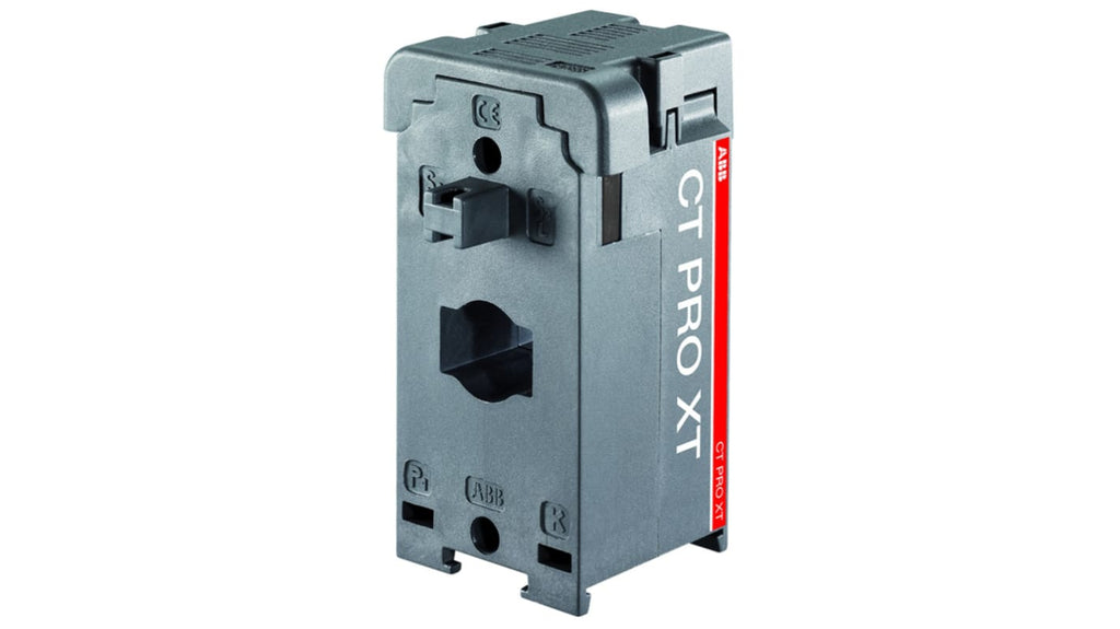 Trasformatore di corrente CT PRO XT ABB, foro 18mm, progettato per installazione nel quadro elettrico, dimensioni compatte 45 x 96 x 69 mm, montaggio su barra di distribuzione o guida DIN, correnti secondarie standard 5 A, protezione IP30, temperatura operativa da -5 a +50 gradi Celsius.