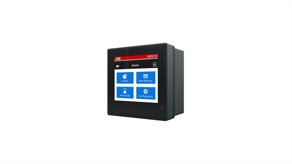 Dispositivo di monitoraggio di potenza ABB, serie M4M 30, 3 fasi, con connettività Modbus. Dimensioni foro 96x96 mm, profondità 77 mm. Precisione di misurazione ±0,5%. Quattro ingressi e quattro uscite digitali, uscita impulsi disponibile. Grado di protezione IP54, temperatura operativa da -25 a +70 gradi Celsius. Montaggio su pannello. Adatto per applicazioni in produzione alimentare, trattamento minerario e impianti di lavorazione dei metalli.