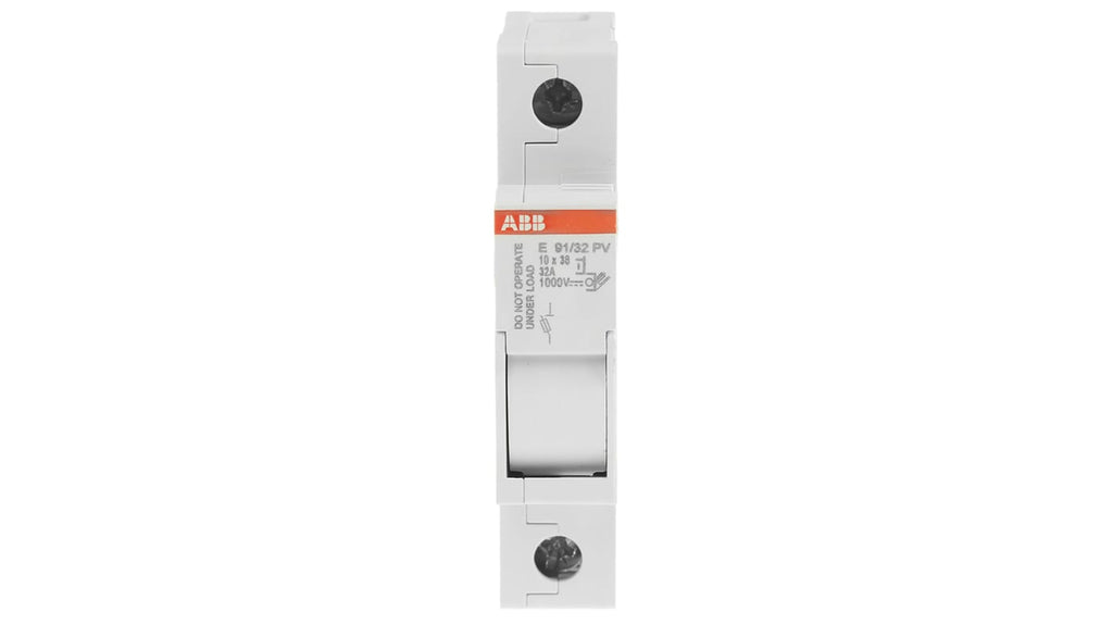 Sezionatore a fusibile ABB, corrente massima 32A, montaggio su guida DIN, fusibile 10 x 38mm, grado di protezione IP20, temperatura operativa da -5°C a +40°C, dimensioni 64 x 18 x 85 mm, peso 61 g, conduttori in rame, compatibile con barre di collegamento e terminali serie S200 di MCB ABB, tipo SP, tensione nominale 1000V, serie E 90 PV.