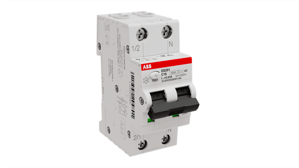 RCBO per circuiti c.a. monofase, 16A, 2 poli, sensibilità 30mA, montaggio guida DIN, serie DS201. Tensione nominale 230/240V, capacità di rottura 6 kA, grado di protezione IP40, terminali a vite. Dimensioni 85 x 69 x 35 mm, durata elettrica fino a 10.000 cicli, conforme RoHS. Protezione contro cortocircuiti e guasti di messa a terra. Adatto per ambienti industriali.