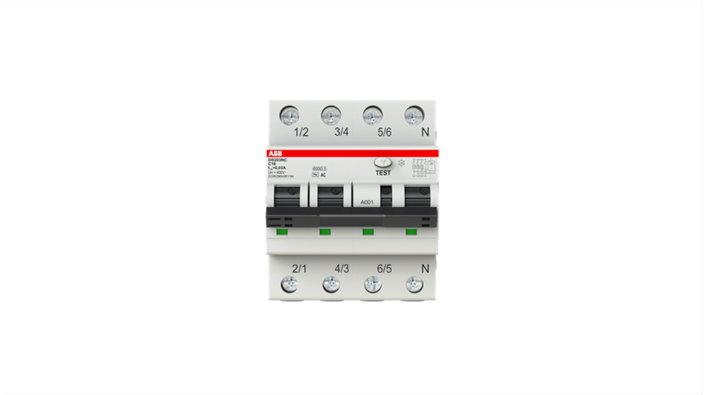 Interruttore automatico di corrente residua RCBO, 4 poli, corrente nominale 16 A, sensibilità 30 mA, caratteristica di intervento tipo C, capacità di interruzione 10 kA, tensione nominale 415 V c.a., montaggio su guida DIN, temperatura operativa da -25 a +55 gradi, dimensioni 85 x 69 x 71 mm, standard CE, durata elettrica 10.000 cicli, durata meccanica 20.000 cicli. Modello AC, serie DS203NC.