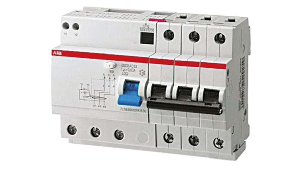 Interruttore automatico salvavita RCBO, montaggio su guida DIN, amperaggio 25A, 3 poli, sensibilità di intervento 30mA, gamma System Pro M Compact, serie DS203, temperatura d'esercizio da -25 a +55 gradi Celsius, campo di frequenza ottimale da 50 a 60 Hz. Marchio ABB.