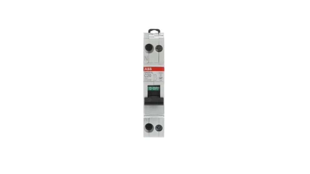Interruttore magnetotermico ABB 1P+N 20A 4,5 kA, Tipo C. MCB serie SN201, corrente nominale 20 A, tensione nominale 230 V, capacità di interruzione 4,5 kA, montaggio su guida DIN, dimensioni 69 mm x 18 mm x 85 mm, tipo di contatto terminale a vite, progettato per protezione contro i cortocircuiti. Adatto per applicazioni di automazione e pannelli elettrici. Codice costruttore 2CSS245102R0204.