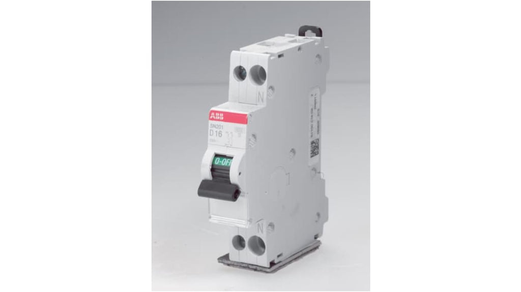 Interruttore magnetotermico ABB 2P 6A, Tipo D, dispositivo a modulo singolo 1P+N, protezione circuiti contro sovraccarichi e cortocircuiti, corrente nominale 6 A, caratteristica di intervento Tipo D, montaggio guida DIN, serie SN201, temperatura operativa -25 a 55 gradi Celsius, grado di protezione IP40.