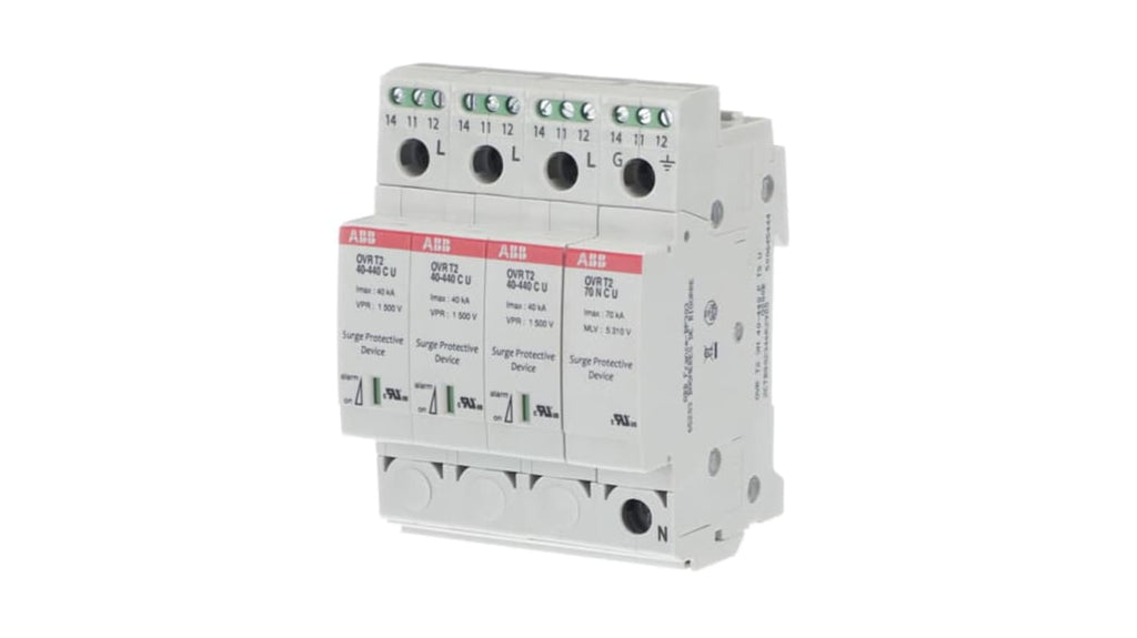 Limitatore di sovratensione industriale, 4 fasi, corrente massima di sovraccarico 100kA, tensione nominale di protezione 1,5kV, classificazione SPD OVR Classe II, montaggio guida DIN, dimensioni 64,8 x 71,2 x 98,5 mm, corrente di scarica 10kA. Progettato per garantire la sicurezza degli impianti elettrici industriali. Codice costruttore 2CTB802346R2900, marchio ABB.