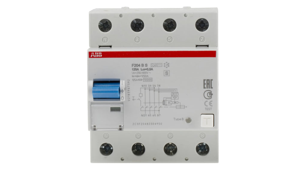 Interruttore differenziale RCCB 4 poli, 125A, sensibilità 500mA, serie F200, tensione nominale 400V ca, tipo di protezione B, montaggio guida DIN, dimensioni 70 x 69 x 85mm, capacità di rottura 10 kA, design compatto, approvazione VDE, conforme a IEC/EN 61008, RoHS, LED verde per monitoraggio, indicazione posizione contatti.