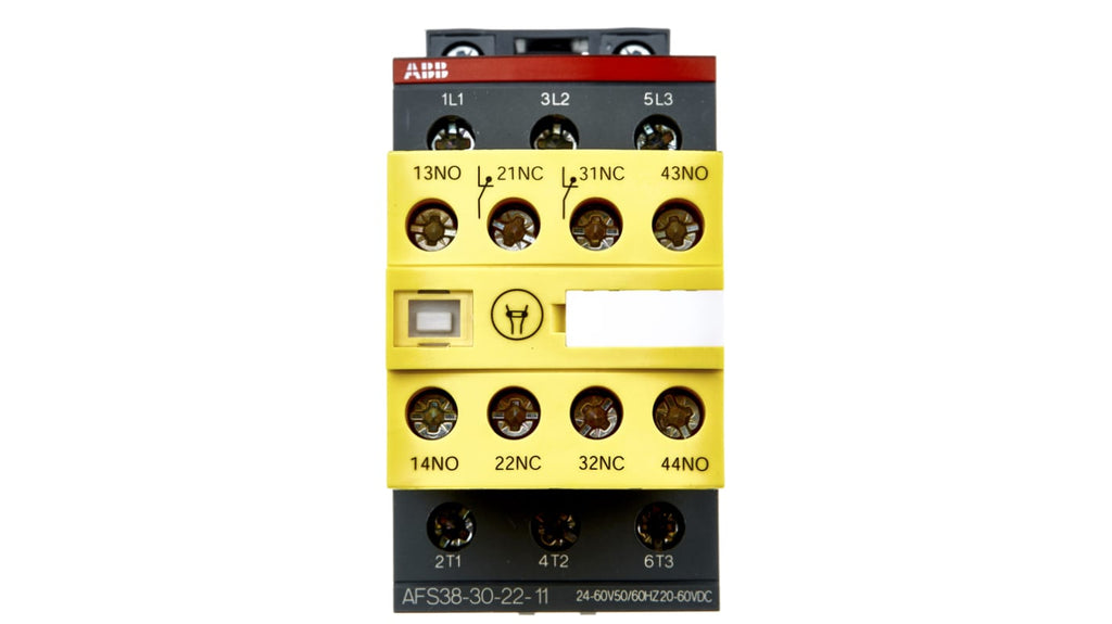 Relè contattore di sicurezza ABB Jokab AFS, 3 poli, 3 NO, tensione bobina 24-60 V CA, corrente nominale contatto 50 A, tensione nominale contatto 600 V CA, configurazione contatti ausiliari 2NO + 2NC, dimensioni 45 mm x 119.5 mm x 80 mm, temperatura operativa -40 a +70 °C, certificazioni CSA C22.2 N°14, EN 60947-1/60947-4-1, IEC60947-1/60947-4-1, UL 508. Alloggiamento giallo per facile identificazione.