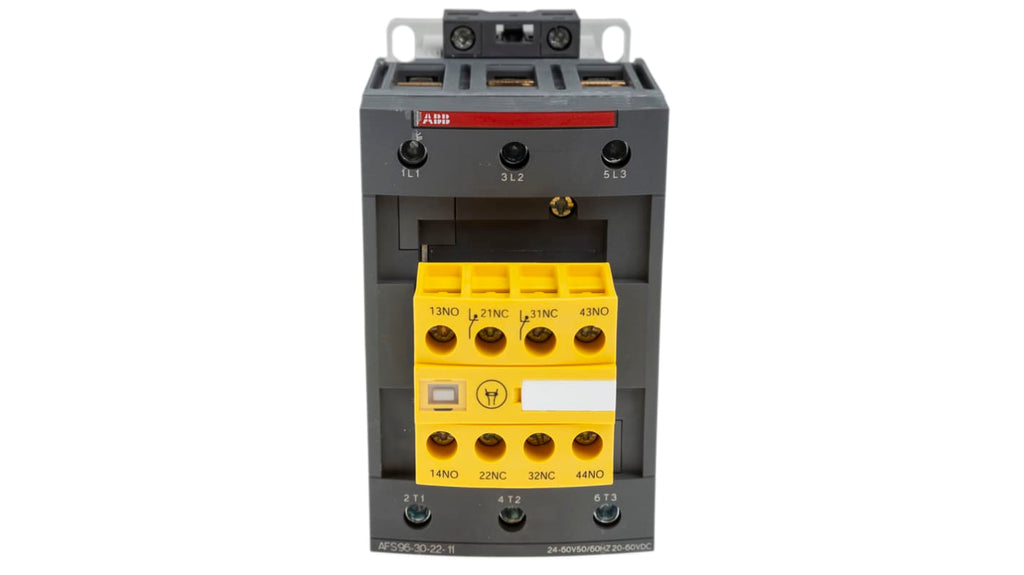Relè contattore di sicurezza ABB Jokab AFS, 3 poli, 3 NO, corrente nominale 130 A, tensione nominale contatto 600 V AC, tensione bobina 24-60 V AC, 20-60 V DC, 50/60 Hz. Dimensioni 70 mm x 149 mm x 119.5 mm, temperatura operativa -40 °C a +70 °C. Circuito di comando con interfaccia elettronica, soppressione di sovracorrente incorporata, contatti ausiliari 2 NO + 2 NC. Montaggio a vite.