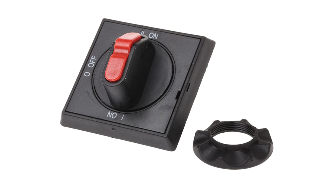 Manopola rotante per sezionatori, compatibile con Serie OT16, colore nero, dimensioni 66x66x34 mm, grado di protezione IP65, meccanismo di rotazione con stati OFF e due stati ON, capacità di contenere fino a tre lucchetti, etichettatura chiara I-O-II, adatta per acciaierie, pannelli di controllo e interruttori di rete da officina. Codice costruttore: OHBS2AJE011 1SCA105220R1001. Marchio: ABB.