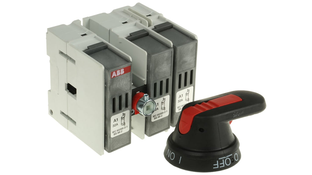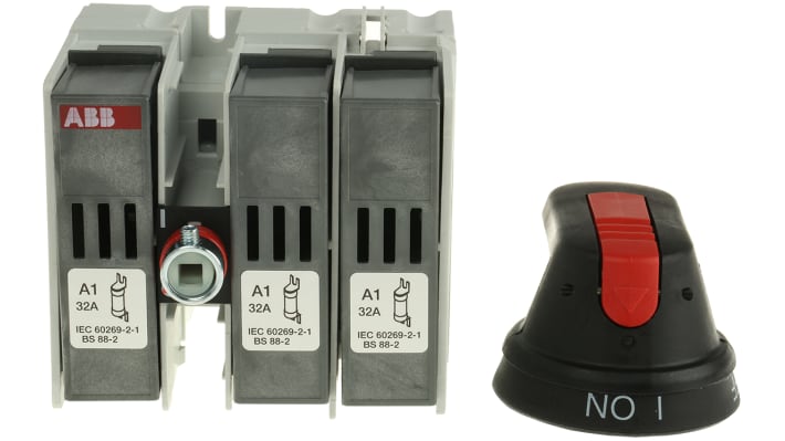 Sezionatore con fusibile ABB, tensione nominale 690 V c.a., corrente massima 32 A, 3 poli, montaggio su guida DIN, tipo terminale a vite, perdita di potenza 3,5 W per polo, dimensioni 106 x 97 x 105 mm, configurazione corsa 3P, contatti ausiliari disponibili, serie OS32FB, fusibile A1. Testato secondo EN 60947-3.