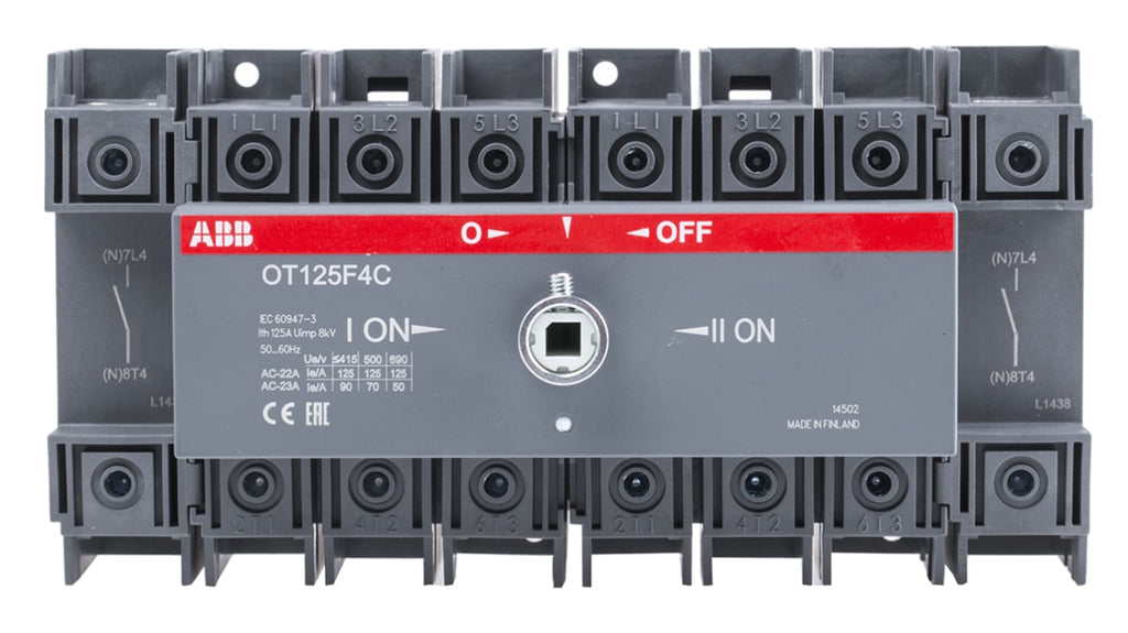 Interruttore di isolamento ABB, 4 poli, montaggio su guida DIN, corrente massima 125A, tensione nominale 750V, potenza nominale 45kW, grado di protezione IP20, dimensioni 86mm x 193mm x 100mm, peso 1,2 kg, accetta cavi da 10 a 70 mm2, durata meccanica 6000 cicli, contatti ausiliari disponibili, colore maniglia nero.