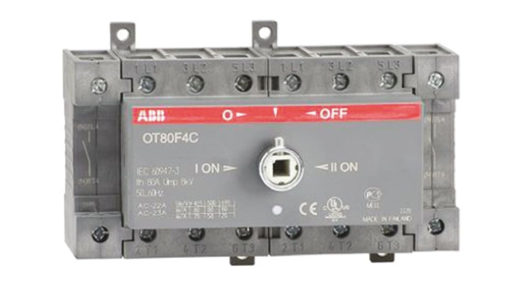 Interruttore di isolamento manuale, 4 poli, corrente massima 80A, montaggio su guida DIN, fase elettrica 3, contatti ausiliari disponibili, configurazione stato normale 4 N/A, configurazione corsa doppio. Adatto per centri di controllo di motori e quadri di controllo. Marchio ABB, codice costruttore OT80F4C 1SCA105418R1001.