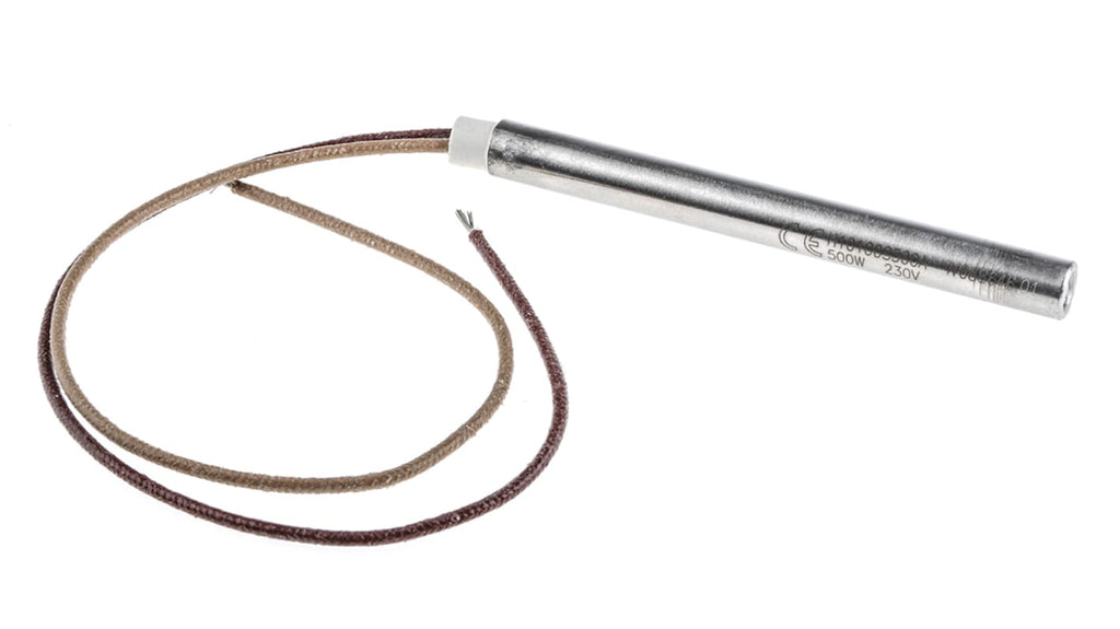 Riscaldatore a cartuccia Acim Jouanin, potenza nominale 500 W, tensione di alimentazione 230 V c.a., lunghezza 100 mm, diametro 10 mm, lunghezza terminali 250 mm. Corpo in acciaio inox, cappuccio terminale in ceramica, base saldata al plasma. Densità watt 19 W/cm², applicabile fino a 750 °C. Certificazioni ANSI/ESD S20.20:2014, BS EN 61340-5-1:2007.