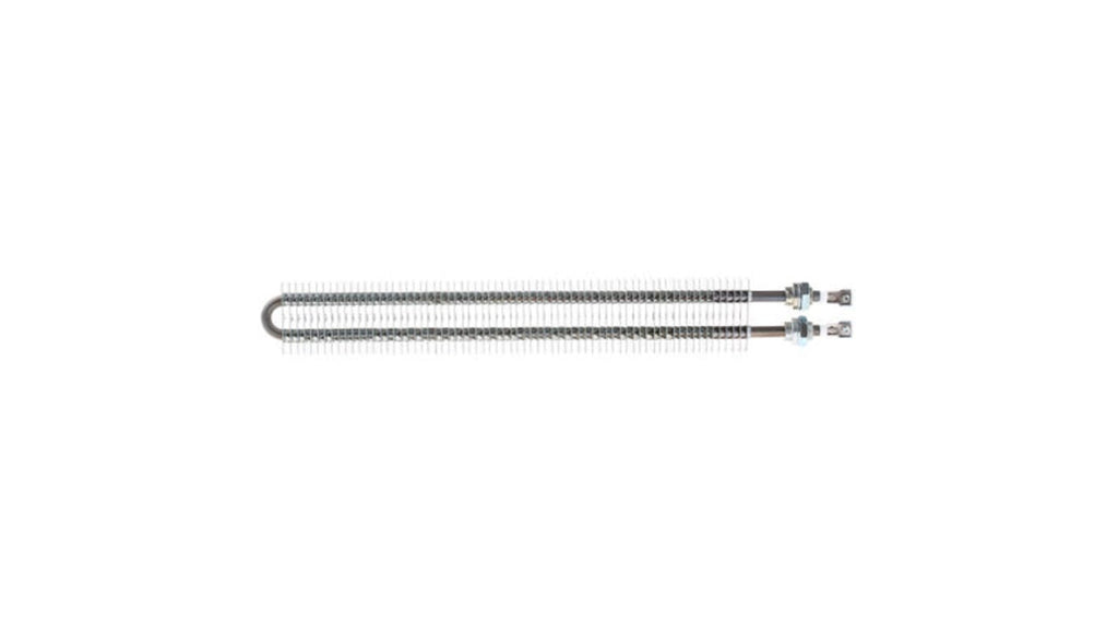 Riscaldatore tubolare alettato per aria, potenza 750 W, tensione 230 V c.a., lunghezza 370 mm. Resistenze rettangolari alettate su tubo schermato in acciaio inox, progettato per riscaldare aria o gas tramite convezione naturale o forzata. Temperatura di picco +200 C. Velocità minima dell'aria consigliata 2,5 m/s. Riconoscimento UL, certificazione CSA. Collegamento a massa richiesto per sicurezza.