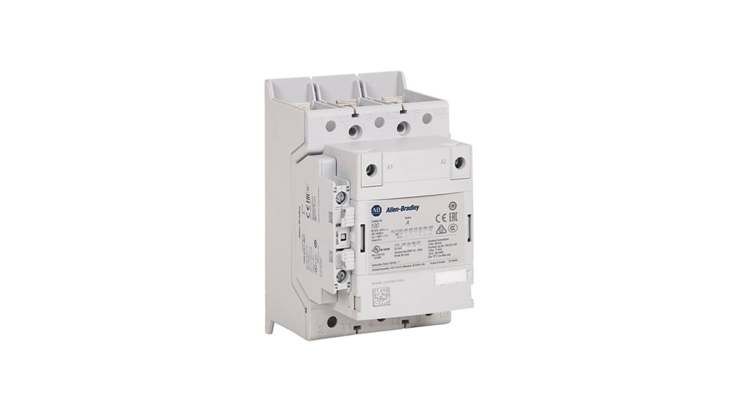 Contattore Direct on Line, Allen Bradley, serie 100-E, 3 poli, 1 NO + 1 NC, tensione bobina 100-250 V cc, corrente nominale 146 A, potenza nominale 75 kW, tensione nominale contatto 400 V c.a., montaggio a pannello, dimensioni 126 mm x 90 mm x 150 mm, temperatura operativa da -40°C a +70°C, collegamenti a barra, 2 contatti ausiliari. Codice costruttore 100-E146KD11.