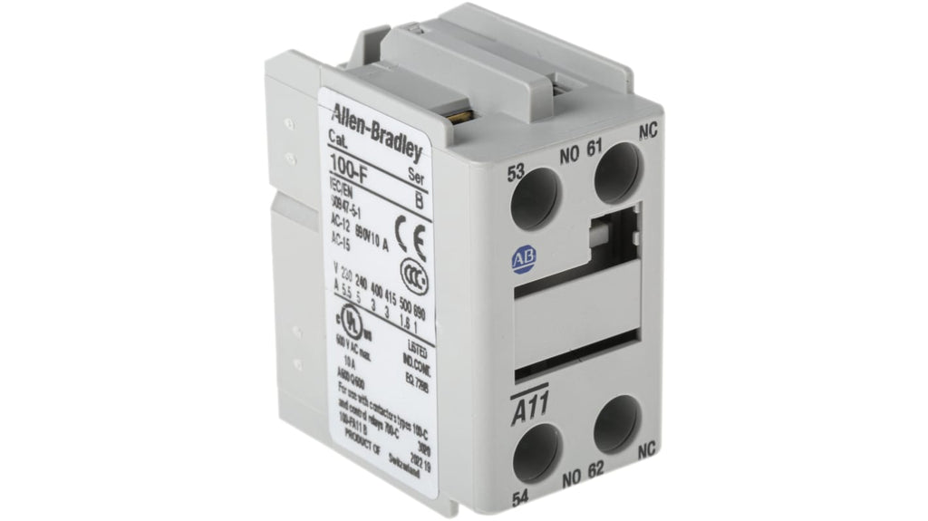 Contatto ausiliario Allen Bradley, 2 contatti, 1 N/C + 1 N/A, montaggio anteriore, serie 100F, corrente nominale 10 A, configurazione DPST, terminali a vite, temperatura operativa -25 a +60 gradi Celsius, blocchi per contattore 2 laterali + 1 superiore, commutazione minima 17 V 5 mA, standard CE, RoHS, CCC. Codice costruttore 100-FA11.