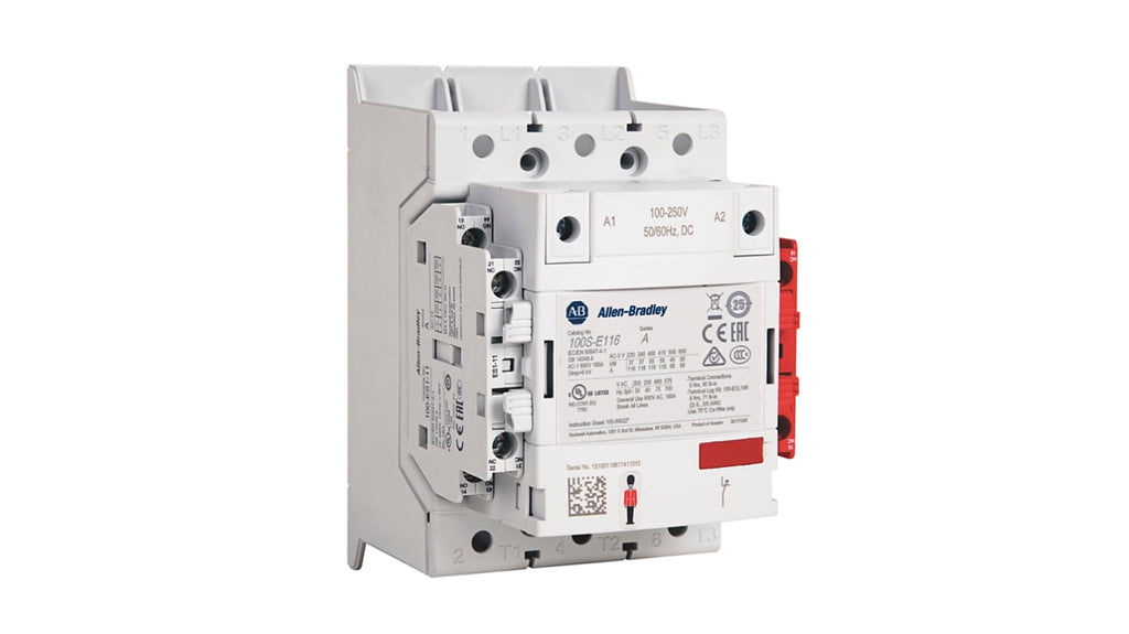 Contattore di sicurezza, 3 poli, corrente nominale 146 A, tensione bobina 100-250 V c.a./c.c., interfaccia PLC, 1 N.O. 1 N.C. standard, 0 N.O. 1 N.C. contatti ausiliari di bassa potenza, tipo terminale a vite, dimensioni 142.5 mm x 90 mm x 150 mm, temperatura operativa da -40°C a +70°C, serie 100S-E, codice costruttore 100S-E146ED12C, marchio Allen Bradley.