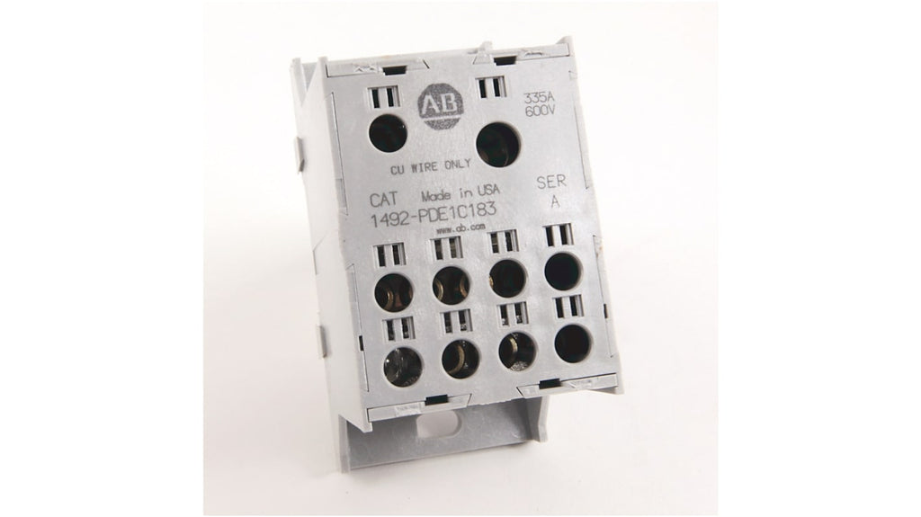Blocco di distribuzione, Allen Bradley, 8 vie, 335A, 600 V, montaggio a pannello, terminazione a vite, dimensione cavo 2,5 mm², custodia in alluminio, protezione IP20, colore bianco, registrazione UL, certificazione CSA, conformità CE, conformità RoHS. Assemblaggio multipolare possibile, viti prigioniere per terminazione.