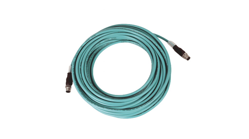 Cavo Ethernet Cat5e con terminazione, lunghezza 20m, schermatura in lamina e treccia, connettori M12 dritti, grado di protezione IP67, temperatura d'esercizio da -40 a 75 gradi Celsius, senza alogeni, colore guaina verde. Progettato per ambienti difficili, garantisce elevata immunità al rumore e perdita di ritorno. Marchio Allen Bradley.