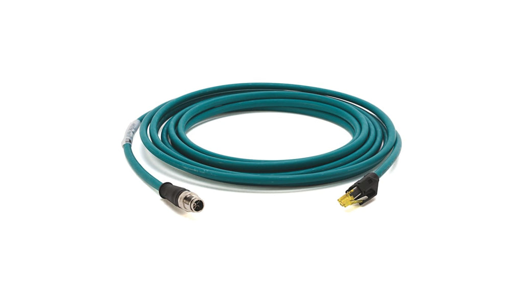 Cavo Ethernet Cat6 con schermatura in lamina e treccia, lunghezza 5m, con terminazione. Marchio Allen Bradley, connettori M12 maschio dritto, grado di protezione IP67. Resistente alla luce solare e all'olio, colore guaina verde, codifica X. Progettato per ambienti difficili, garantisce elevata immunità al rumore e perdita di ritorno.
