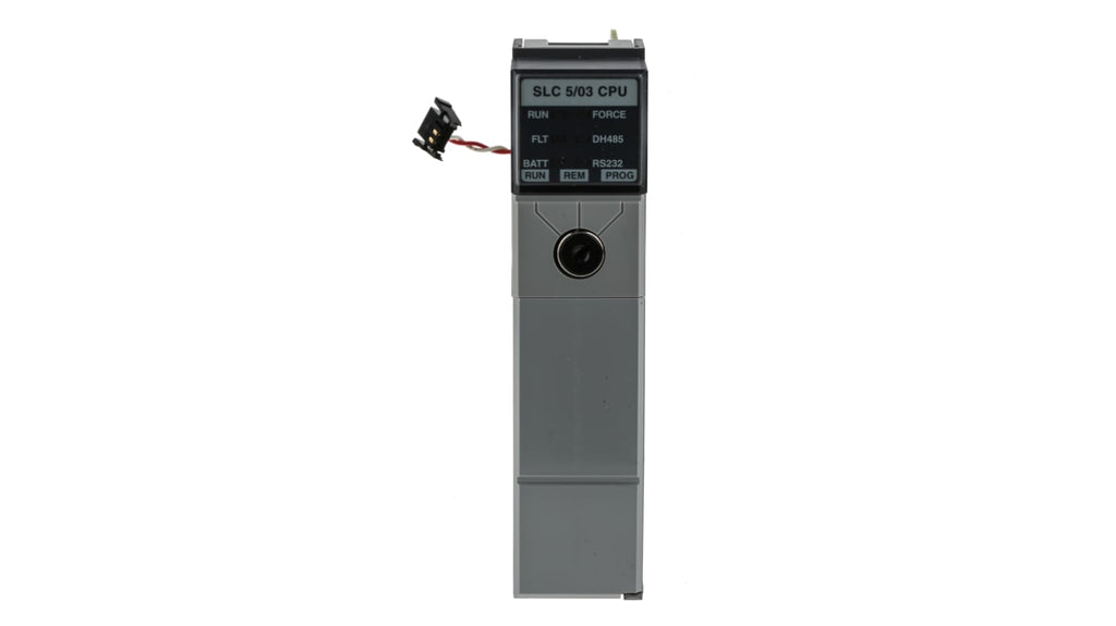 CPU PLC modulare Allen Bradley SLC 500, tensione 5-24 V, memoria 16000 parole, tempo di esecuzione bit 0,44 microsecondi, interfaccia di programmazione computer, linguaggio Ladder Logic, due porte di comunicazione DH485 e RS232, dimensioni 145 x 35 x 142 mm, intervallo di temperatura operativa 0-60 gradi Celsius, batteria di backup inclusa, standard CE e UL. Montaggio a pannello.