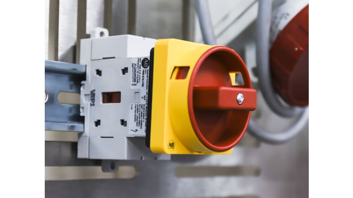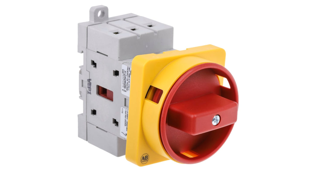 Interruttore di isolamento Allen Bradley, 3 poli, corrente massima 16 A, tensione nominale 690 V ca, potenza nominale 7,5 kW, montaggio a pannello, grado di protezione IP66, attuatore rosso/giallo, dimensioni 63 mm x 36 mm x 51 mm, temperatura operativa da -25 a +60 gradi, lucchettabile, portata interruttore 20 kA, conforme a norme CE e cUL.