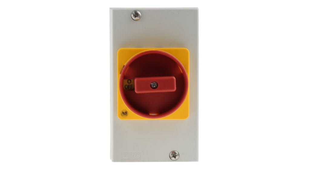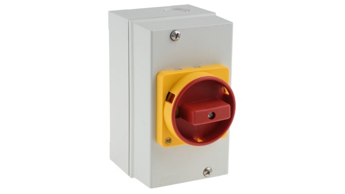 Interruttore di isolamento Allen Bradley, 3 poli, 16A, 690V ca, potenza nominale 7,5kW, grado di protezione IP66, bloccabile in posizione Off, ingresso cavo M25/M32, dimensioni 120mm x 70mm x 70mm, temperatura operativa da -25°C a +60°C, conforme a IEC, UL, CE, CSA. Sezionatore chiuso rosso con maniglia rossa, accessori modulari snap-on disponibili.