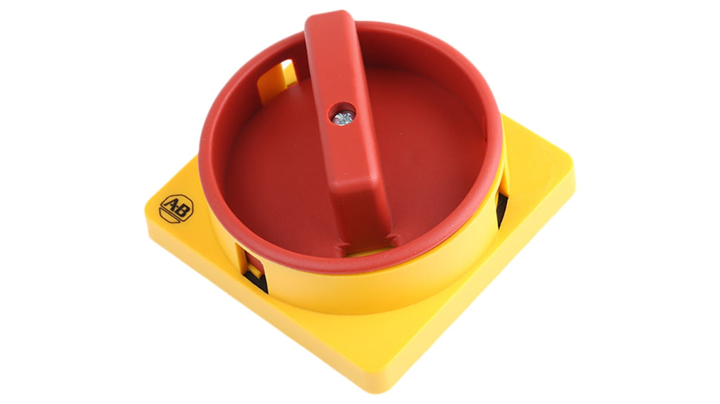 Manopola rotante per interruttori, compatibile con la Serie 194E, colore rosso/giallo, grado di protezione IP66, numero di chiusure 3, progettata per il sistema di controllo modulare MCS 9mm Grid System, materiali riciclabili, viti terminal universali per cacciaviti a lama piatta o Pozidriv, categoria di commutazione AC23A. Codice costruttore 194L-HE6N-175, marchio Allen Bradley.