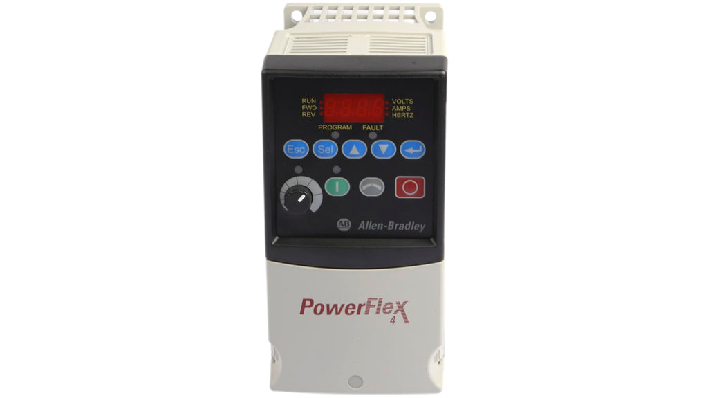 Inverter trifase Allen Bradley PowerFlex 4, potenza nominale 1,5 kW, tensione di alimentazione 400 V c.a., corrente nominale 4 A, frequenza di uscita 240 Hz, grado di protezione IP20, montaggio su guida DIN o a pannello, comunicazione ModBus, dimensioni 152 mm x 80 mm x 136 mm. Progettato per il controllo di motori c.a., pompe, ventilatori e convogliatori.