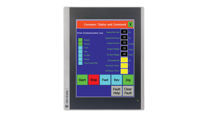 Display HMI touch screen Allen Bradley, PanelView 800, 10 poll, LCD TFT. Risoluzione 800 x 600 pixel, processore 800 MHz, memoria onboard 256 MB, retroilluminazione LED. Interfacce Ethernet e USB, grado di protezione IP65, tensione di alimentazione 24 V c.c. Dimensioni 287 x 225 x 55 mm, temperatura operativa da 0 a 50 gradi Celsius. Certificazioni UL, CE, RCM, KC. Codice costruttore 2711R-T10T.
